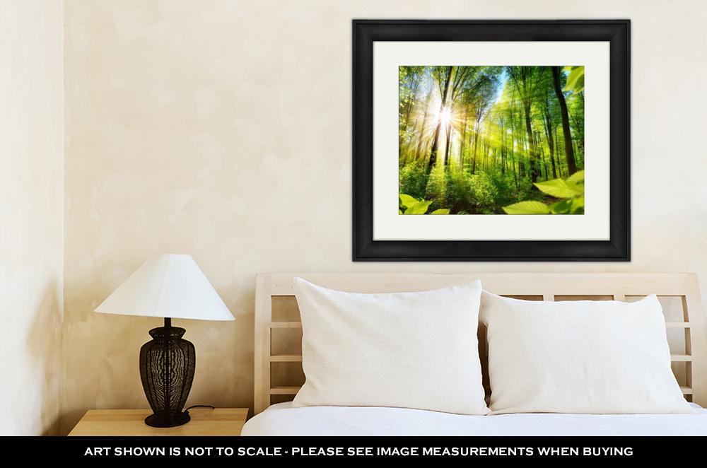 Framed Print, Scenic Forest Of Fresh Green Deciduous Trees Framed By Leaves With The Sun