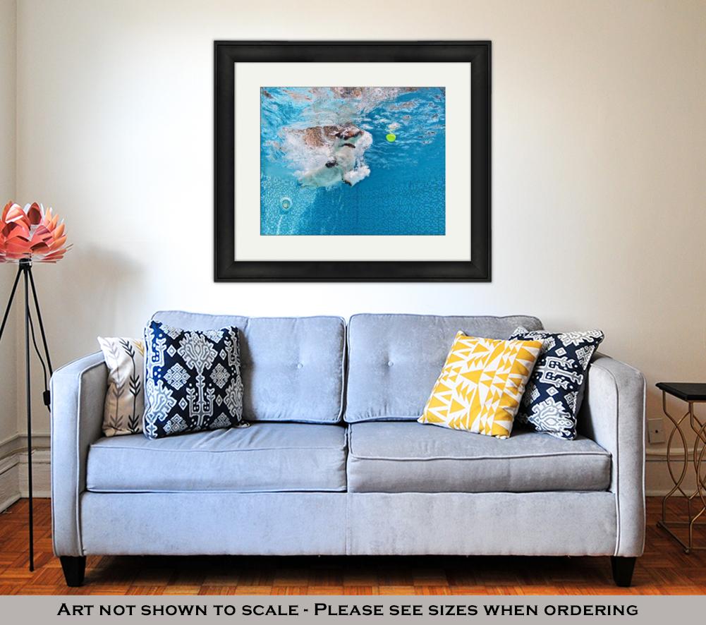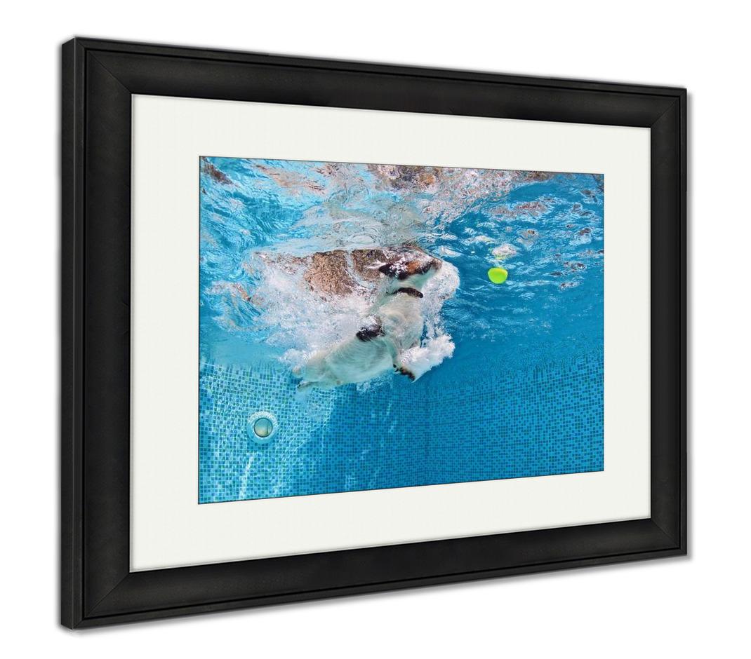 Framed Print, Playful Jack Russell Terrier Puppy In Swimming Pool Has Fun Dog Jump And Dive