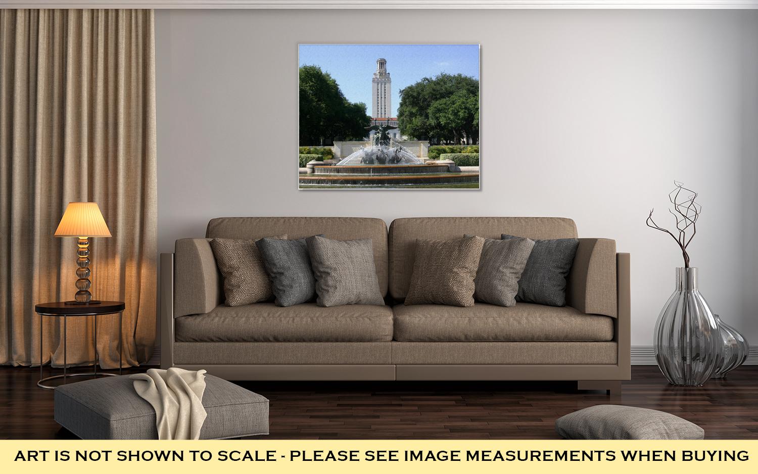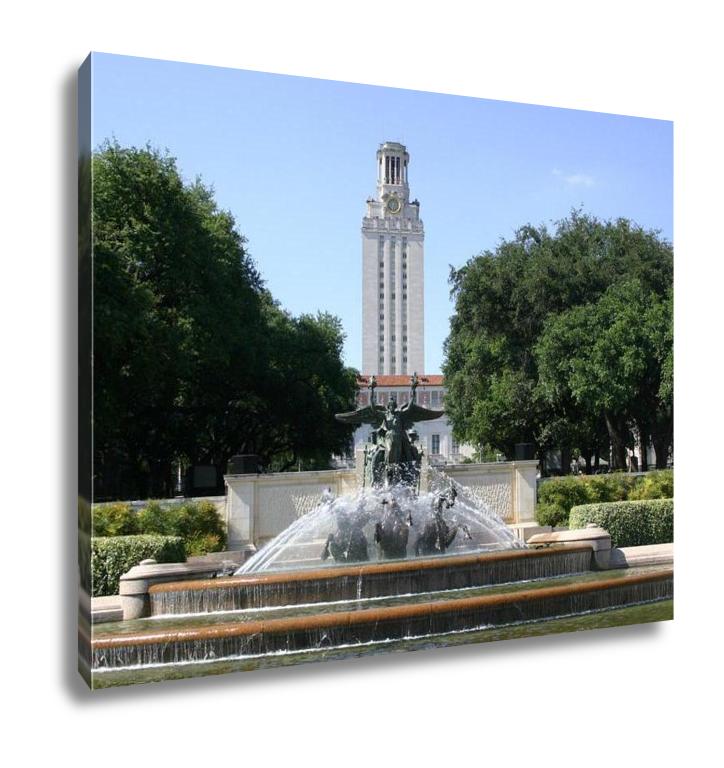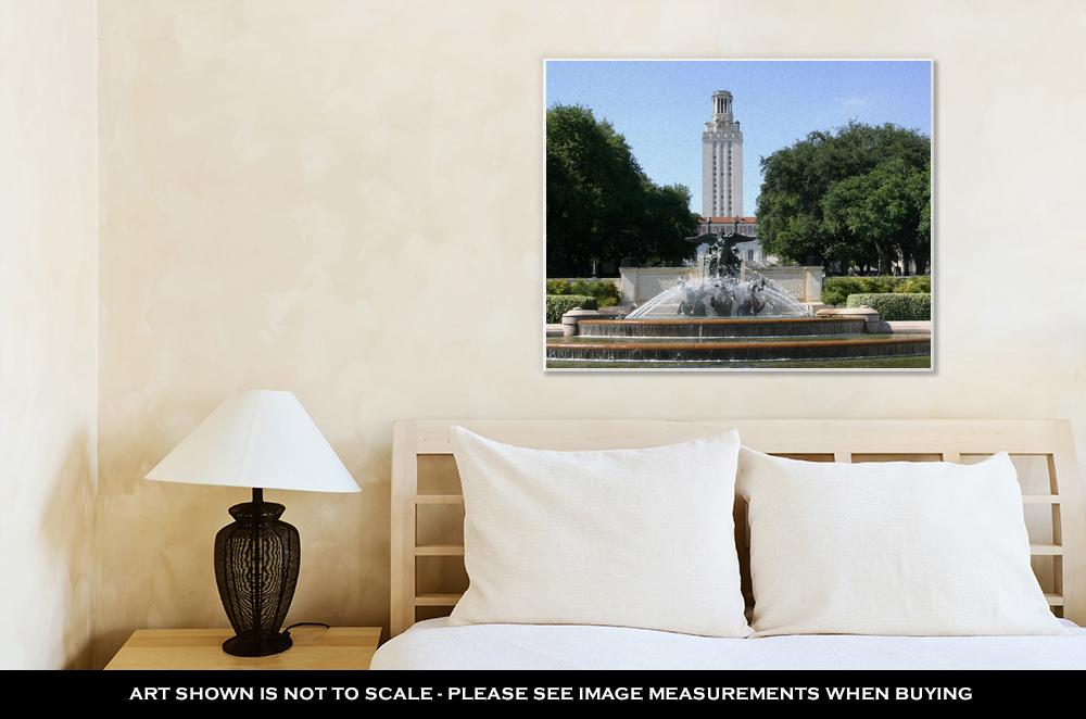 The artist who provided this image described the image in this way: A picture of the University of Texas tower in Austin with fountain in front.