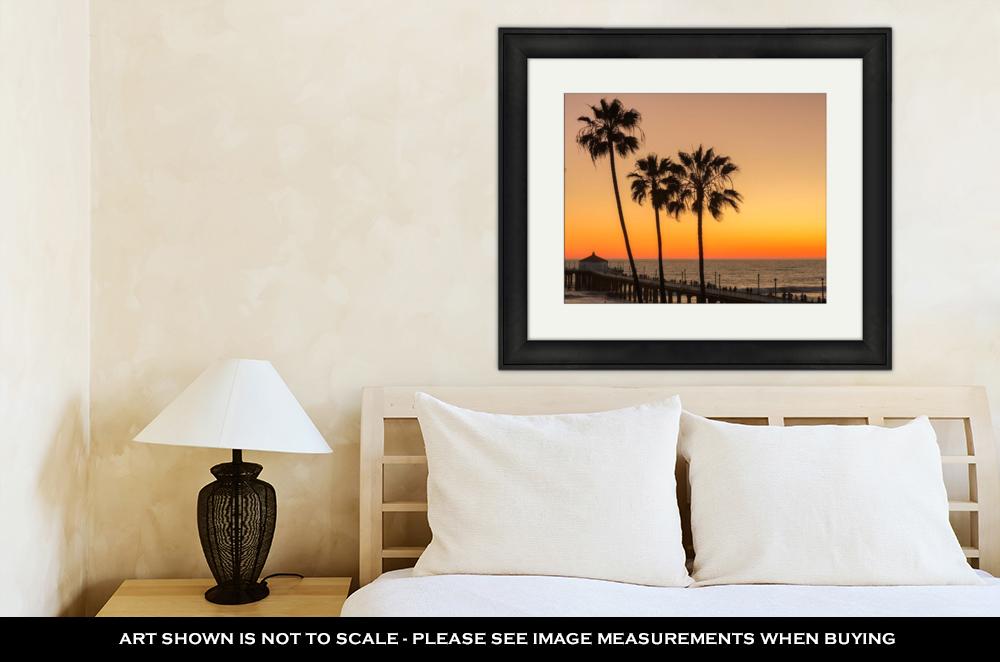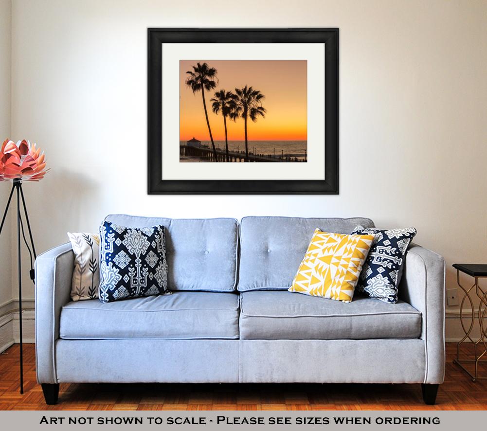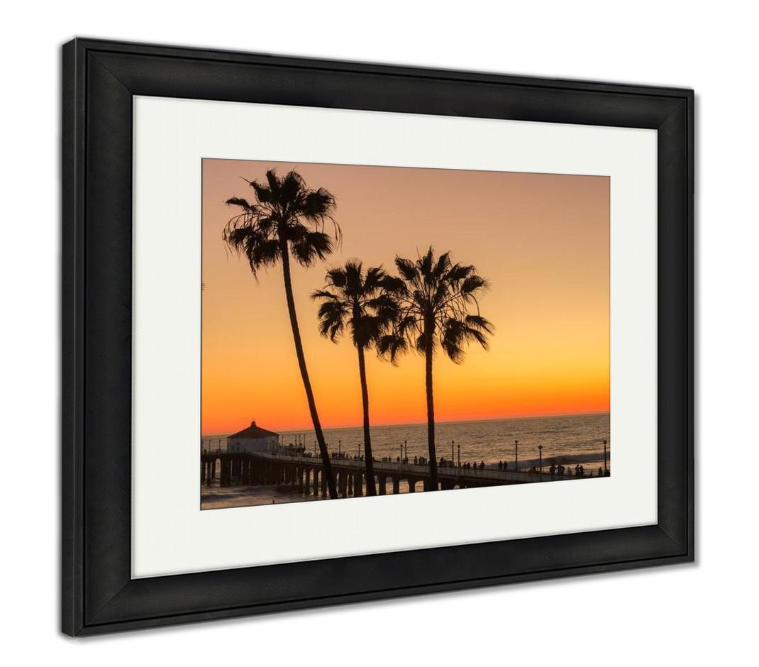Framed Print, Los Angeles Palm Trees Manhattan Beach Pier Under Beautiful