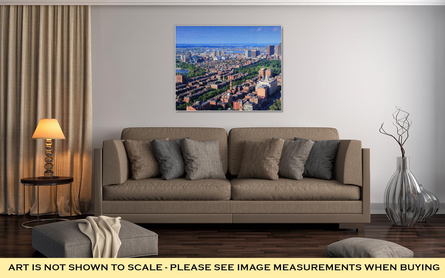The artist who provided this image described the image in this way: Boston Massachusetts in the United States. City aerial view with Boston Common and the downtown.