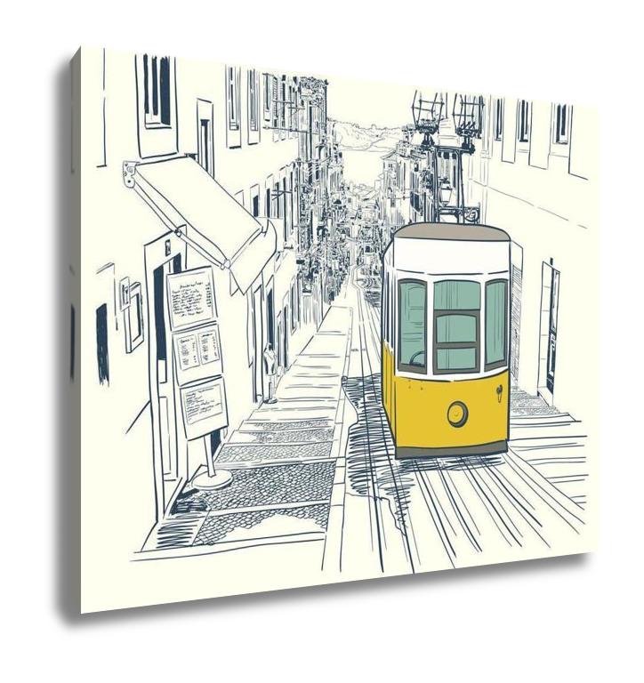 The artist who provided this image described the image in this way: Vector illustration of the street drawn in sketch style. Quiet street in Lisbon with yellow tram and sketched houses. Postcard template.